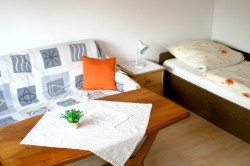 Im zweiten Schlafzimmer steht ein Einzelbett sowie eine Schlafcouch die als Einzelbett oder Doppelbett umgebaut werden kann,ein Schrank, ein Schreibtisch und ein Stuhl.