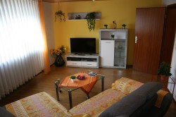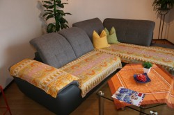 Im Wohnzimmer befindet sich eine Eckcouch, ein Sessel, ein Couchtisch, ein Wohnschrank und ein Sat-TV Gerät. Ausserdem stehen Ihnen verschiedene Familienspiele zur Verfügung.